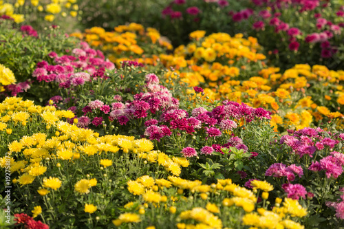 chrysanthemum, a lot of purple and yellow flowers in the open air, selective sharpness