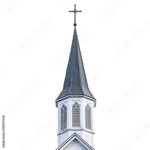 Church building steeple with cross, isolated on transparent background, symbolizing Christian faith, religion, and sanctuary, an architectural landmark for belief and worship.