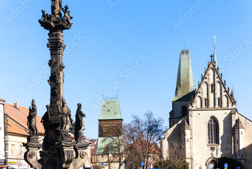 outdoors, outside, exterior, europa, east europe, czech republic, czechoslovakia, bohemia, town, urban, architecture, building, church, column, pillar, statue, square, history, historic, historical, old, sight, travel