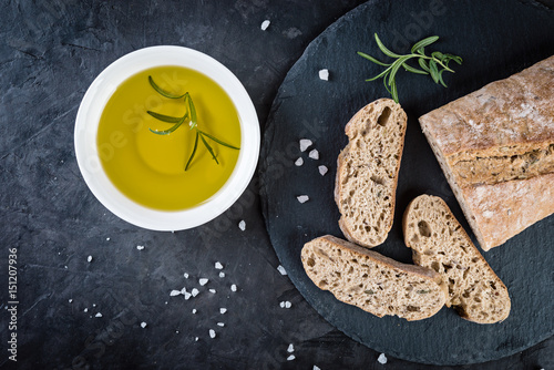 ciabatta bread with oil and rosemary on black stone background, top view