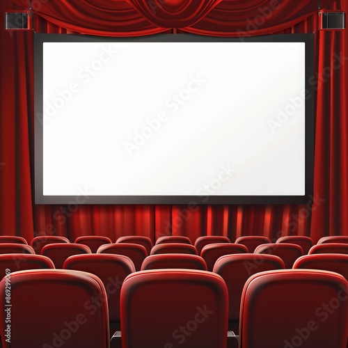 Cinema hall with white blank screen. Rows of seats, red cinema chairs. Theater empty scene. Movie theatre. Generative AI