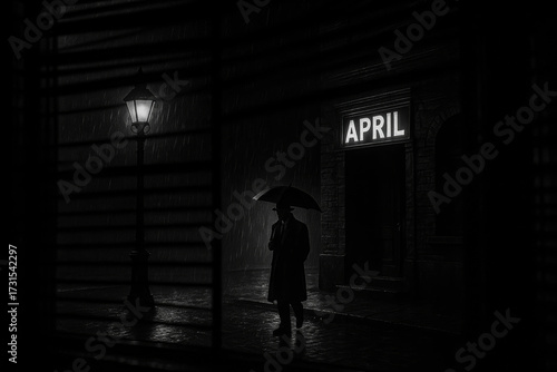 Cinematic noir April illustration: rainy street at night, man in trench coat with umbrella under lamppost light, bar named “APRIL” glowing in background, dark moody atmosphere.