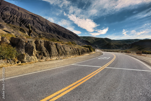 Cinematic road landscape. Humahuaca valley, Altiplano, Argentina. Misty road