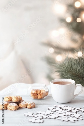 cinematic shot of cozy table setup featuring puzzle game in progress accompanied by tea and biscuits