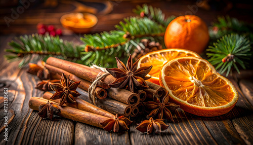 Cinnamon sticks star anise dried oranges and pine branches on wood.