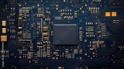 Circuit board background and electronics minimal, A close-up view of an intricate circuit board featuring various components, including a prominent central chip, set against a dark blue background.