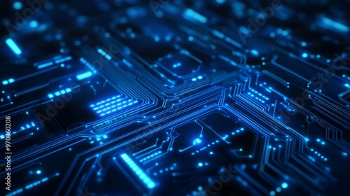 Circuit board. Dynamic blue emitting light, representing high-speed data transfer and connectivity. Digital Blue Light.