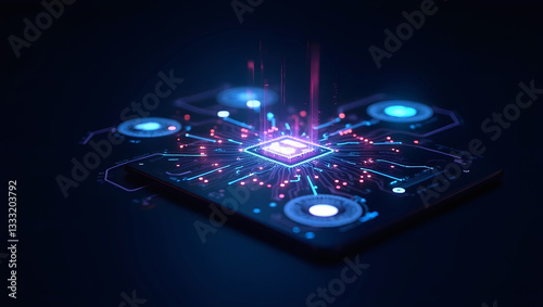 Circuit chip neon blue panel with glowing elements and advanced technology