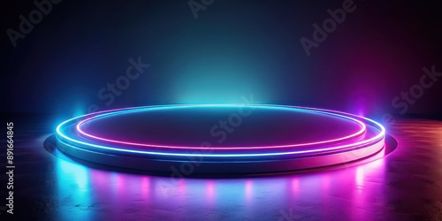 Circular abstract surface with neon lights, technology, elegance, high-tech, blue, dark, mysterious, futuristic, digital