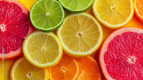 Circular arrangement of sliced citrus fruits--lemon, lime, orange, grapefruit--vibrant colors, top view, bright clean background.
