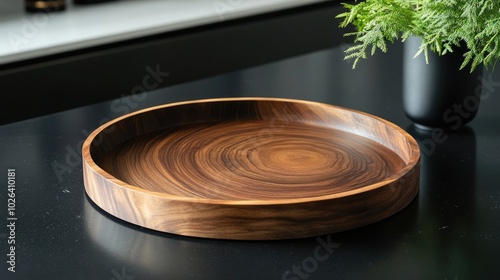 Circular wooden tray on a black table, with a natural, saw-cut design, evoking a rustic, minimalist kitchen aesthetic, perfect for trendy interior