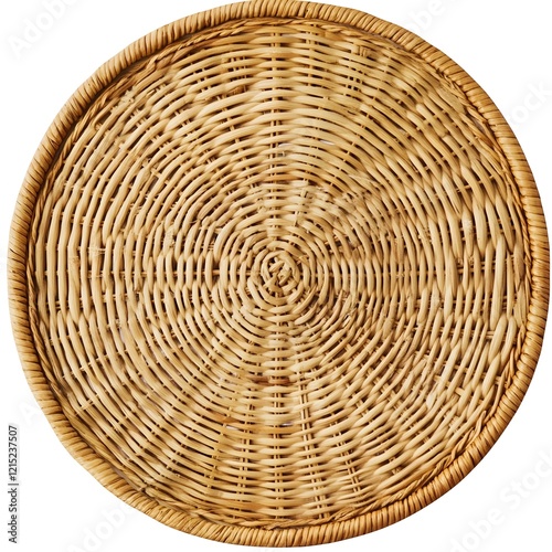 Circular woven basket, top-down view, rattan texture, natural beige color, intricate spiral pattern, handcrafted, rustic, flat surface, wicker placemat, traditional craftsmanship, organic materials