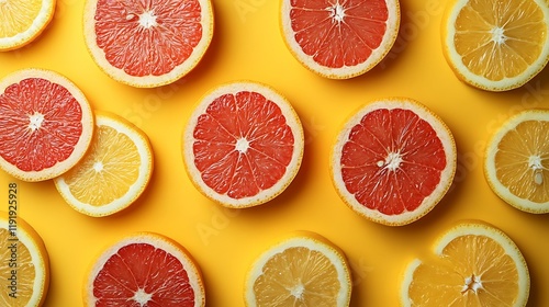 Citrus fruit slices pattern, yellow background, healthy food, vibrant colors, flat lay