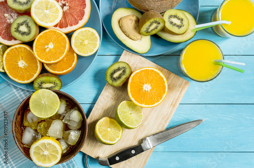 food, eating, organic, healthy, fruit, freshness, ripe, sweet, drink, dieting, summer, diabetes, lifestyle, table, dessert, addiction, sour, wood, taste, gean, collection, colours, group, cooking, antioxidant, vegetarian, bowl, citrous, orange, grapefruit, kiwi, lemon, lime, coconut, avocado, juice, juicy, board, knife, towel, cut, slice, ice, blue, bright, colourful, topview, yellow, red