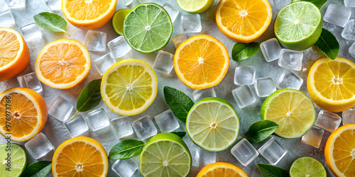 Citrus fruits (orange, lemon, lime) and ice cubes, fruits, citrus, orange, lemon, lime, ice, cubes, refreshing, summer