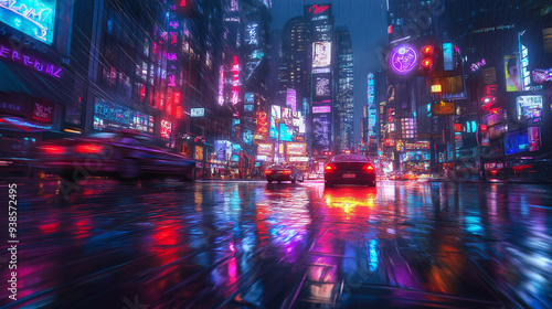 City at Night Background with Detailed Skyline Neon Signs and Vibrant Reflections