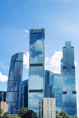 City buildings reflect sunlight in Moscow City with clouds in the sky