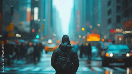 city, urban, street, rainy, crowded, downtown, traveler, backpack, building, tall, light, night, people, car, traffic, blur, motion, wet, scenic, commuting, lifestyle, bustling, perspective, outdoors, travel, adventure, solitude, exploration, city landscape, architecture, mist, fog, colourful, contemporary, metropolis, journey, black, mysterious, edgy, atmosphere, wanderer, independence, dynamic, bustling, vibrant, modern, individual, scenery