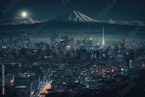 city ​​light background in japan with view of mount fuji generated by ai