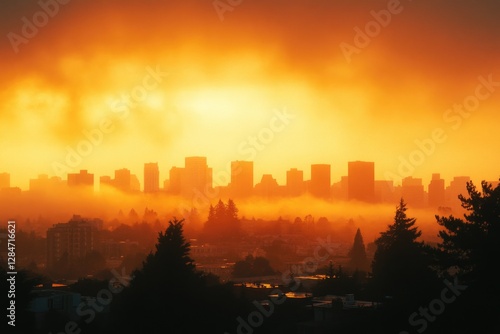 sunset, fog, city landscape, urban, cloud, gold, hours, twilight, panoramic, metropolitan, skyline