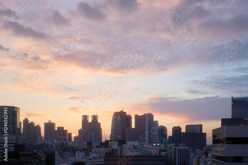 City skyline at sunset with colorful clouds and silhouette of buildings. Tokyo, Japan