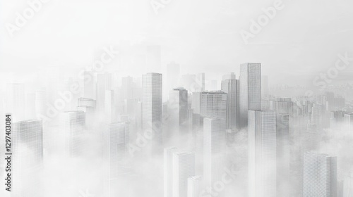 City skyline shrouded in fog, aerial view, urban landscape, background