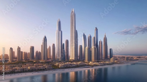 City skyline with towering skyscrapers, blending steel, glass, and white exteriors