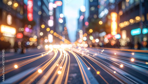 City Street at Night: A mesmerizing night scene of a bustling city street with blurred lights creates a sense of dynamic movement, capturing the pulse of urban energy.