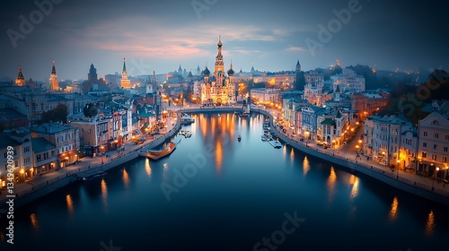 city landscape, city, dusk, evening, water, canal, building, architecture, historical, tour tourism, travel, russia, moscow, kremlin, landmark, panoramic, aerial, view, night, light, illuminated, colourful, vibrant, european, old, town, europa, picturesque, charming, scenic, beauty, amazing, stunning, photo, photo, urban, tranquil, serene, waterway, boat