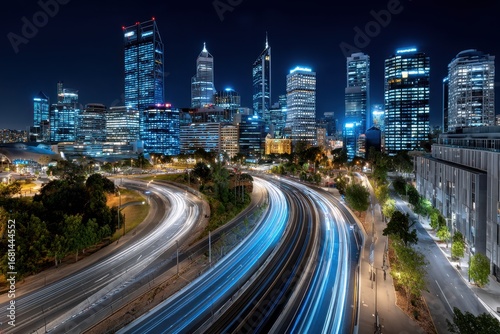 city, night, city landscape, light, traffic, urban, modern, building, skyscraper, skyline, architecture, downtown, road, street, transportation, long exposure, evening, dark, illuminated, glow, business, metropolis, travel, destination, tour tourism, landscape, scene, view, perspective, aerial, australia, perth, western australia, expressway, highway, car, vehicle, motion, blur, speed, energy, vibrant, dynamic, commercial, office, residential, contemporary