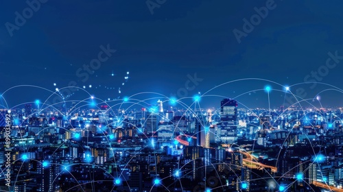 city landscape, night, network, connection, urban, technology, digital, datum, communication, cyberspace, wireless, city, skyscraper, building, light, blue, dark, glowing, abstract, futuristic, modern, connectivity, global, cyber, earth, networked, connected, urbanisation, progress, development, illuminated, horizon, sky, street, street light, future, graphic, design