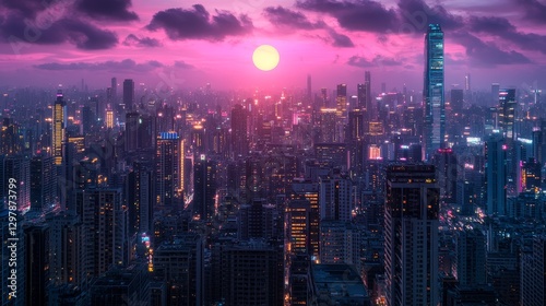 city landscape, urban, skyline, night, city, sunset, building, tower, evening, modern, panorama, dusk, scene, view, light, architecture, sky, travel, street, tour tourism, business, illuminated, background, asia, purple, vibrant, metropolis, aerial, up high, construction, futuristic, dreamy, fantasy, peaceful, prosperity, wealth, opportunity, development, beautiful, freedom, hope, majestic