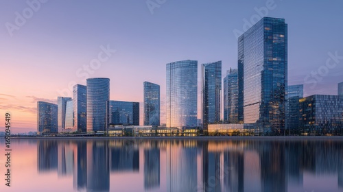 Cityscape Dawn Reflection Modern skyline at sunrise, tranquil waters reflecting urban scene, ideal for business or travel