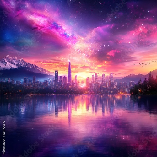 city landscape, twilight, celestial, skyline, cosmos, sky, imagination, horizon, cosmic, scenic, fantasy, dreamy, digital artwork, dream, vibrant, landscape, nebula, scenic view, serene, aglow, peaceful, futuristic, tranquil, artistic, nature, mountain, star, beautiful, colourful, panoramic, majestic, calm, reflected, urban, starry, bright, aethereal, night, downtown, modern, water, outdoors, architecture, building, illustration