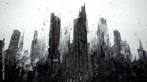 cityscape featuring abstract skyscrapers with digital overlay, creating futuristic and surreal atmosphere. image evokes sense of technology and urban life