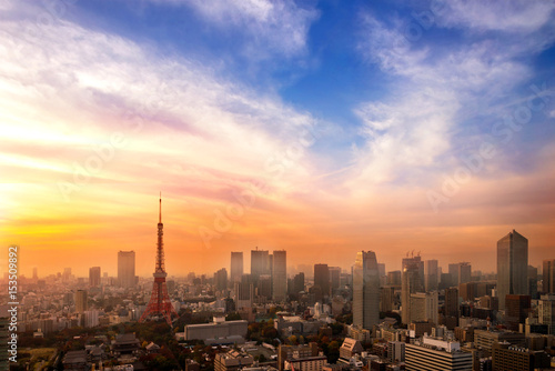 Cityscape of Tokyo, city aerial skyscraper view of office building and downtown of tokyo with sunset / sun rise background. Japan, Asia