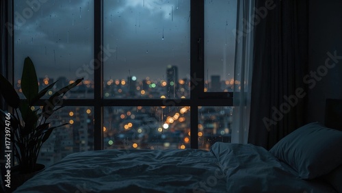 Cityscape through rain-streaked window with lights after dark, indoor scene. Nighttime, weather, urban landscape, and interior setting. The scene of night, rain, and city illumination.