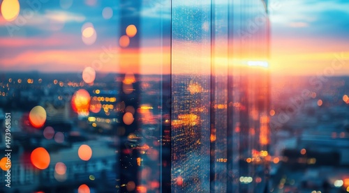 city landscape, sunset, city, view, glasses, modern, urban, skyline, light, bokeh, vibrant, colours, horizon, building, architecture, evening, night, perspective, window, exterior, light, sun, orange, red, blue, illuminated, blur, detail, texture, abstract, contemporary, dynamic, impression, imprint, glow, landscape, metropolis