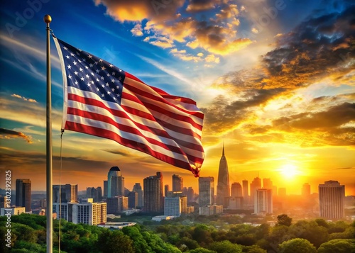 flag, city, city landscape, urban, patriotism, country, nation, skyline, building, architecture, wave, waving, banner, symbol, national, pride, freedom, liberty, independence, memorial, historical building, background, texture, image, photo, photo, illustration, graphic, design, element, asset, vertical, horizontal, sunset, sunrise, dusk, dawn, blue skies, cloud, street, road, tower, skyscraper, night, day, summer, spring, autumn