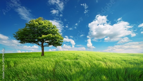 clairiere ensoleillee en pixel art arbre solitaire verdoyant ciel bleu nuageux herbe vibrante et atmosphere sereine