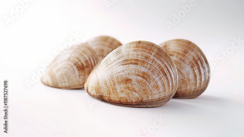 Clamshell Trio: Three clam shells elegantly arranged, showcasing their unique textures and intricate patterns, bathed in soft, natural lighting.