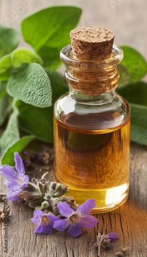 Clary Sage Essential Oil in Glass Bottle with Fresh and Dried Clary Sage on Rustic Wooden Background