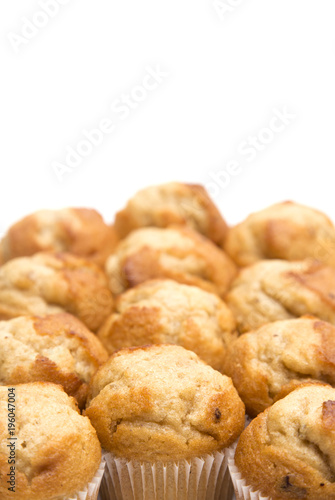 muffin, banana, nut, fruit, food, protein, classic, cake, cupcake, breakfast, unhealthy, mini, small, miniature, tiny, healthy, bakery, baked, cooked, professional, wrapper, wrapped, case, paper, bread, white, background, isolated, group, 12, batch, copy, space, blank, area