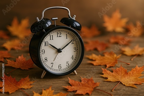 Classic black analog alarm clock with twin bells surrounded by autumn orange and yellow leaves on wooden surface.