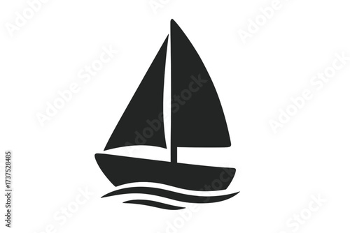 Classic black sailboat silhouette with sails up navigating calm ocean waves