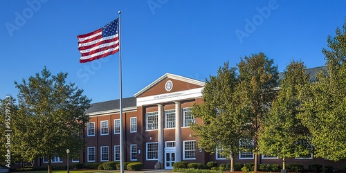 Classic brick school building exterior under clear blue sky, showcasing American education architecture with green trees and flags waving in the breeze