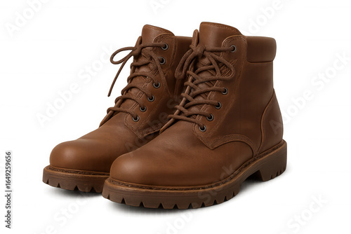 Classic brown leather hiking boots with tied laces, isolated on a transparent background, ready for outdoor adventures