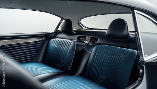Classic Car's Interior: Elegant Blue Leather Seats, Detailed Design, Vintage Vehicle's Backseat, Stylish Coupe, Automotive Luxury, Retro Aesthetics, High-