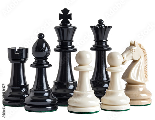 Classic chess pieces, a king, queen, rook, bishop, knight, and pawns