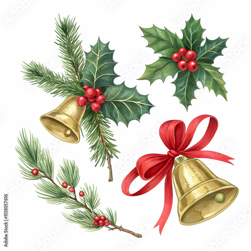 classic christmas decoration with golden bells, holly leaves, pine branches, and red ribbon on white background